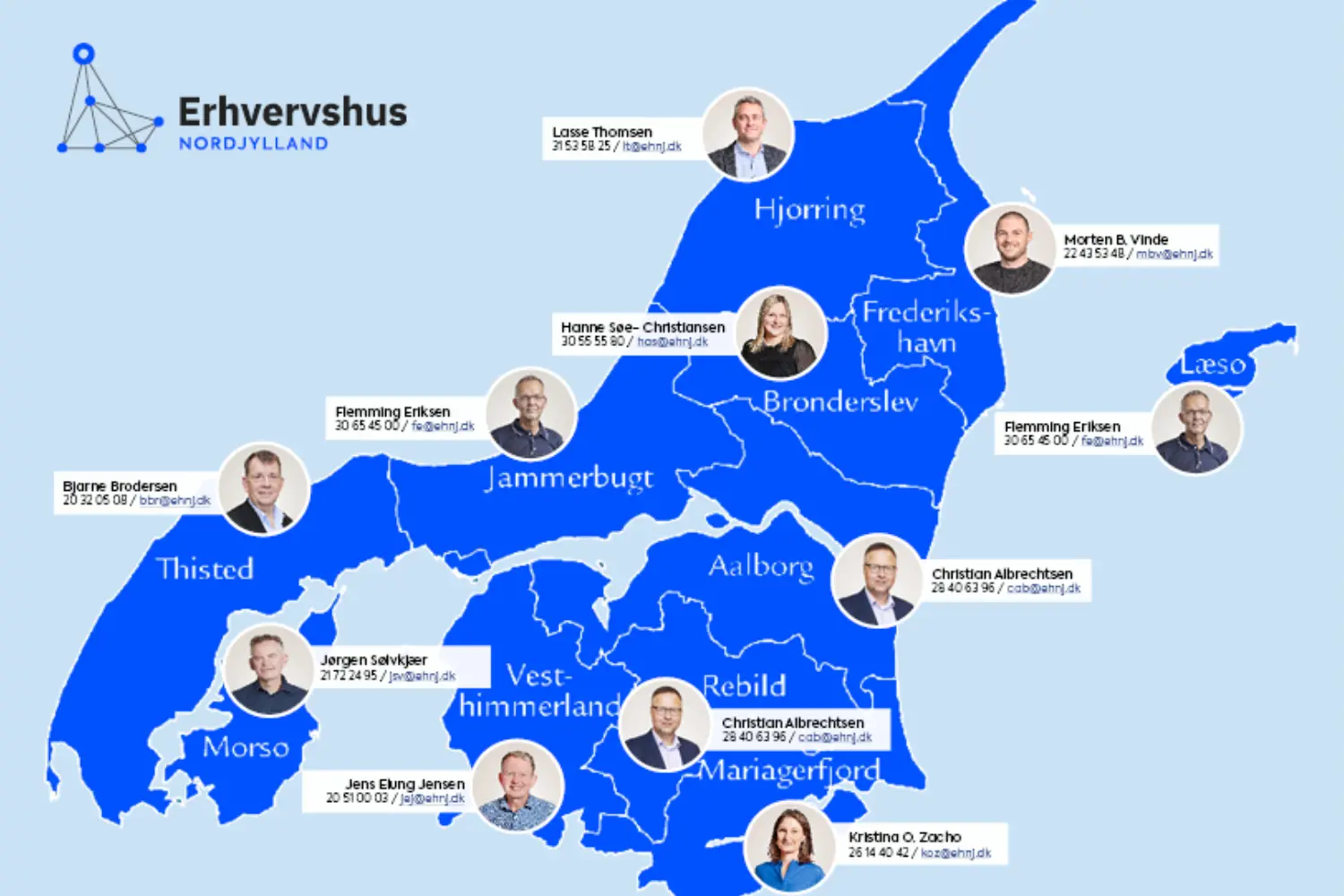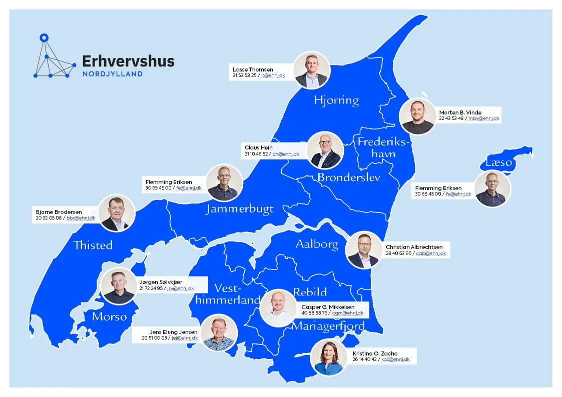 Vi samarbejder tæt med de lokale erhvervskontorer i Nordjylland. Hos dit lokale erhvervskontor i din kommune kan du få basal vejledning om opstart og drift af din virksomhed. Du kan også deltage i arrangementer og iværksætterkurser.